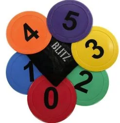 Gummiskiver med nummer og forskellige farver. Der kan laves et utal af øvelser med reaktion, og hastighed.