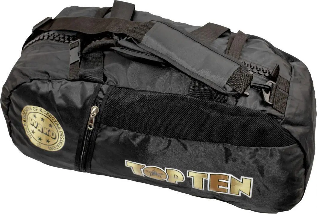 Tasken er lavet af vejrbestandig nylon, går du ikke på kompromis med kvalitet inden for sport såvel som rejser. Det store hovedrum er lukket med en overdimensioneret lynlås, og de ydre lommer i siden. I den forstærkede bund af tasken er rygsækstropperne perfekt beskyttet, indtil de bruges. Ud over det TOP TEN-mærketryk finder du WAKO-mærkningen påført slidstærk.